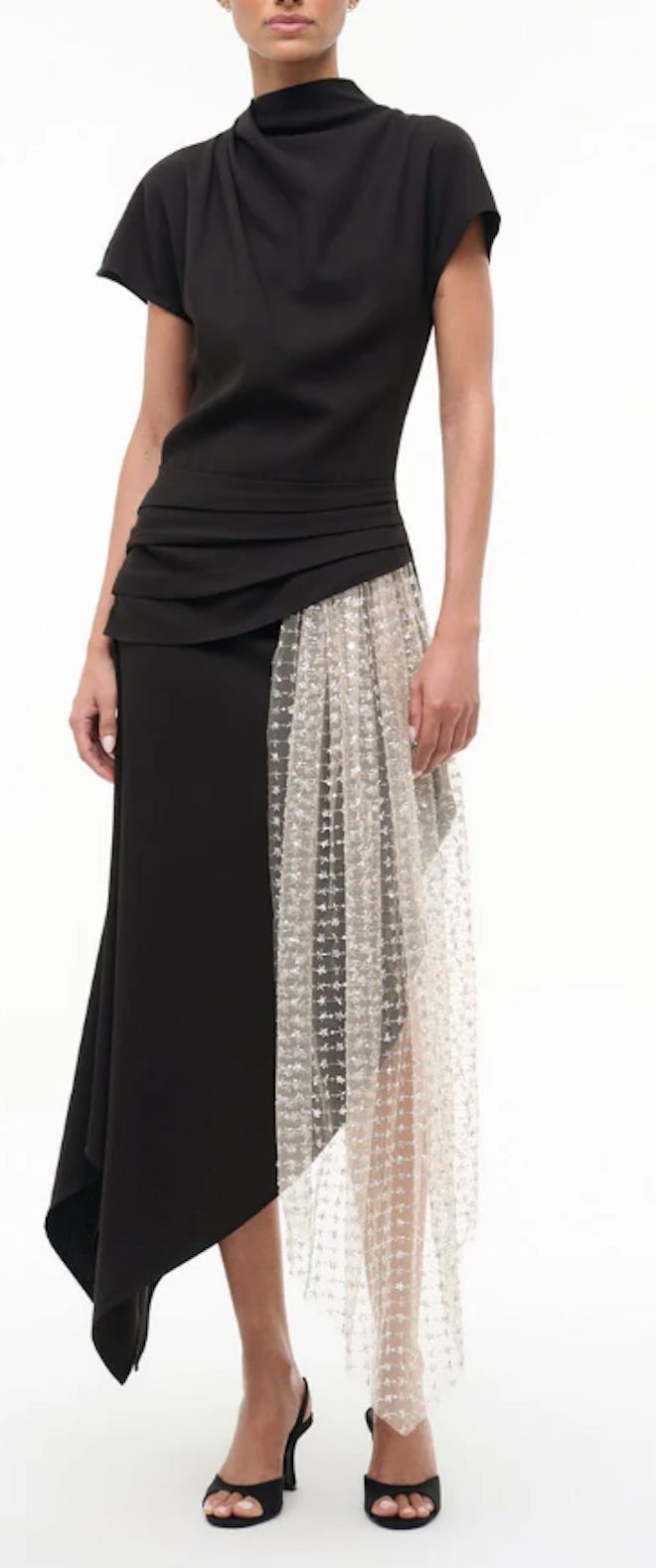 Whether it’s a holiday work party or an intimate soirée with friends, this dress is designed to make an entrance. The high cowl neckline and asymmetrical hem create a striking silhouette, while the crystal-like, light-catching fabric adds just the right amount of sparkle.