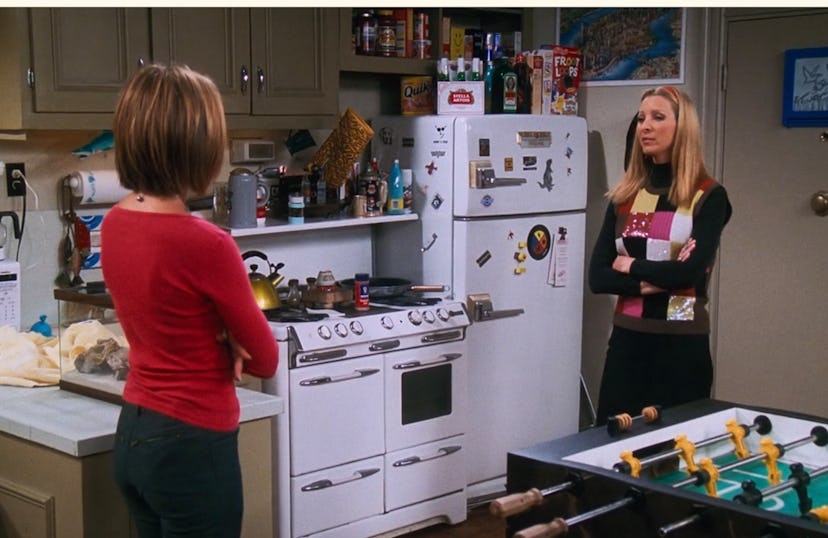 Anyone who has watched Friends knows the show is awash with ’90s fashion inspiration. In “The One With the Holiday Armadillo,” the outfits skew casual rather than overtly festive, perfect for a low-key gathering with friends. Rachel’s red V-neck top is undeniably cute, but Phoebe’s sequined checkerboard vest steals the scene. Styled with a red headband, it feels like an easy blueprint for a chill gathering this year.