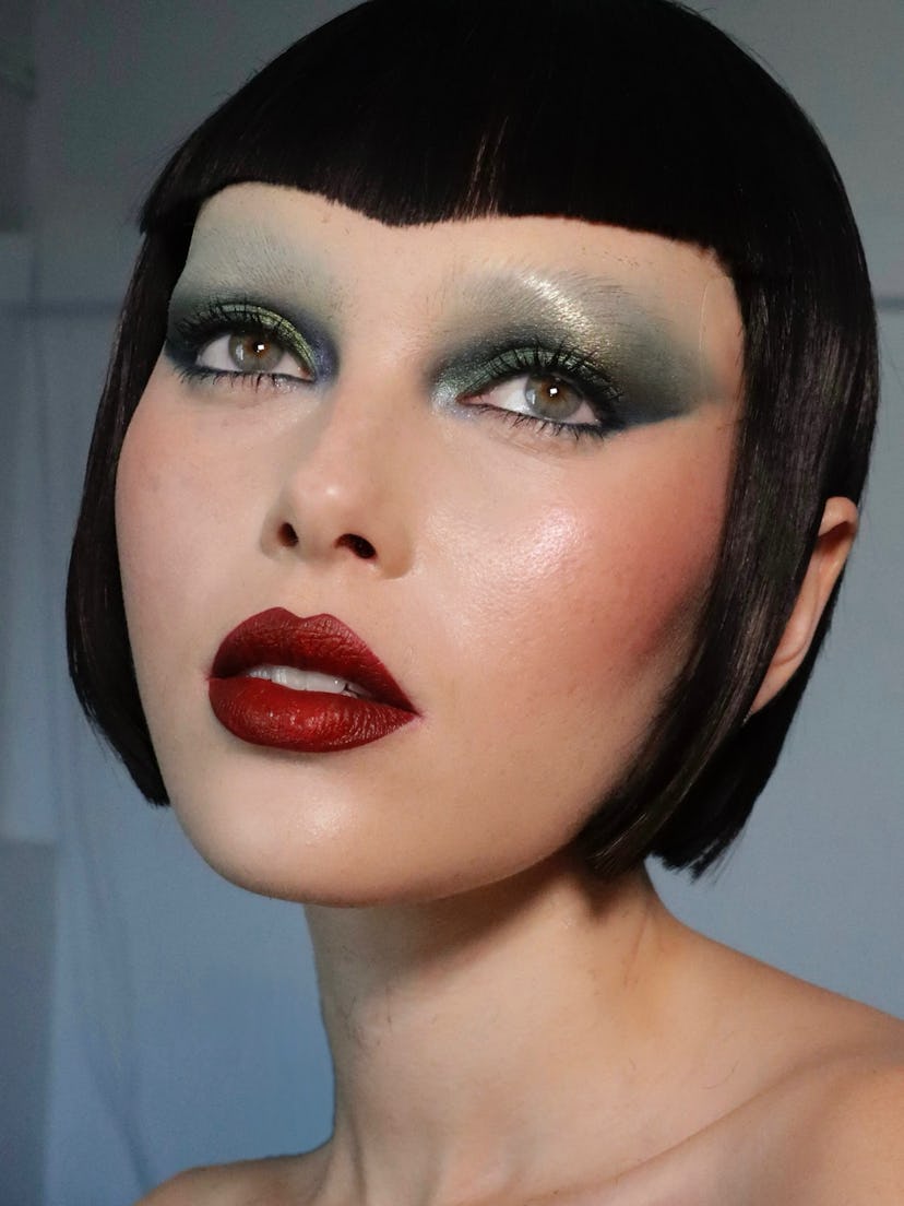 The holidays may be nearly a year away, but done right, you can absolutely get away with “Christmas” colors all year long. This makeup by Nikki combines forest green with silver and gold eyeshadows in such a way that it reads as a conventional smoky eye. And the dark crimson lip is forever a classic.