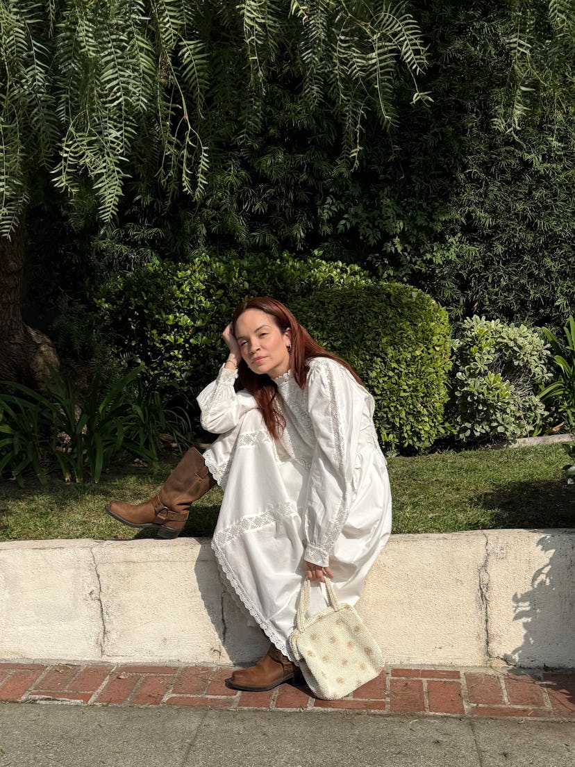 “I love that this collection strikes the perfect balance of Parisian elegance and New York cool and ease. This dress is a shining example as it includes traditional dainty detailing like eyelet and lace overlay as well as a roomy, comfy silhouette that allows for easy movement. To keep things from looking overtly precious, I grounded the outfit with a pair of work boots from Frye and added a touch of heirloom via a vintage beaded bag. It’s the perfect look for a breezy spring day in LA.”