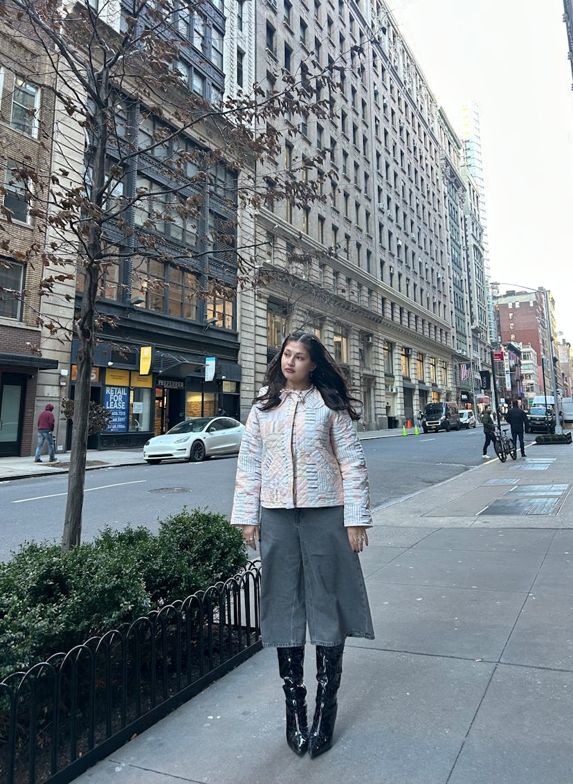 “As someone who tends to stick to darker colors, it was refreshing to take a step in a lighter direction with this gorgeous multi-colored jacket. I adore the quilted texture and hidden buttons, and the bow-tie detail at the top is absolutely darling. The sleeves are roomy enough to fit a sweater underneath which is essential during the colder seasons. I also love that the collar is removable, making it versatile. Whether you’re going for cottagecore or something a little more boho, both aesthetics work beautifully here. I styled this piece with a pair of gray jorts and black patent leather pointed-toe boots for a day in the office.”