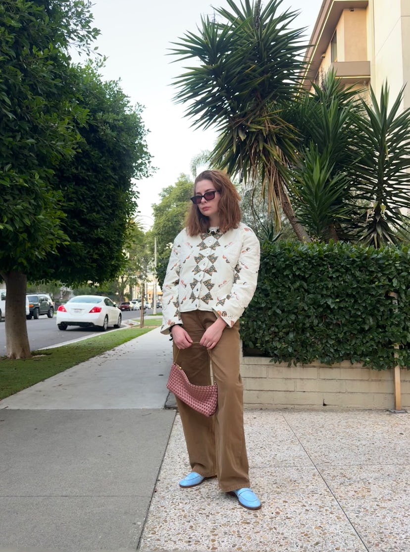 “Sézane and Sea are two of my favorite contemporary brands at the moment, so when I heard of their third collaboration, I had a feeling it would be right up my alley — much like the first two. And it was, thanks to the lineup of ladylike, vintage-inspired silhouettes. I gravitated toward the Dakoty jacket, a quilted topper emblazoned with colorful embroidered patches. It’s the kind of piece I know will become a staple in my wardrobe for seasons to come, as it’s just as chic as it is comfortable. As for styling, I paired the outerwear with Staud khaki pants — which I’ve been wearing non-stop this winter — a blush pink satin Naghedi bag, and powder-blue loafers from Jonak Paris.”