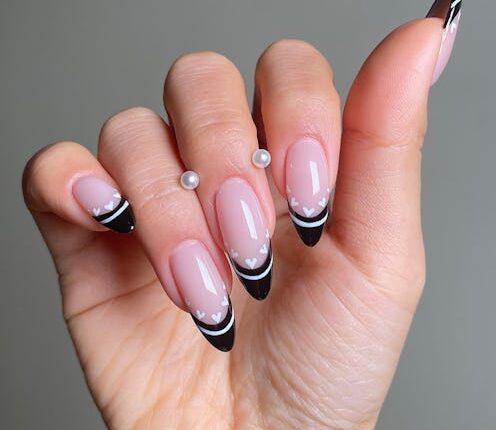 The subtleties of this manicure speak volumes. First, there’s the classic design in a tuxedo color palette. Then, there are the small hearts that outline the curve of the nail’s tip. The final look is an elegant set that works well beyond February 14th.