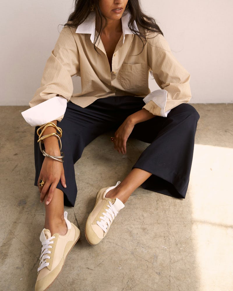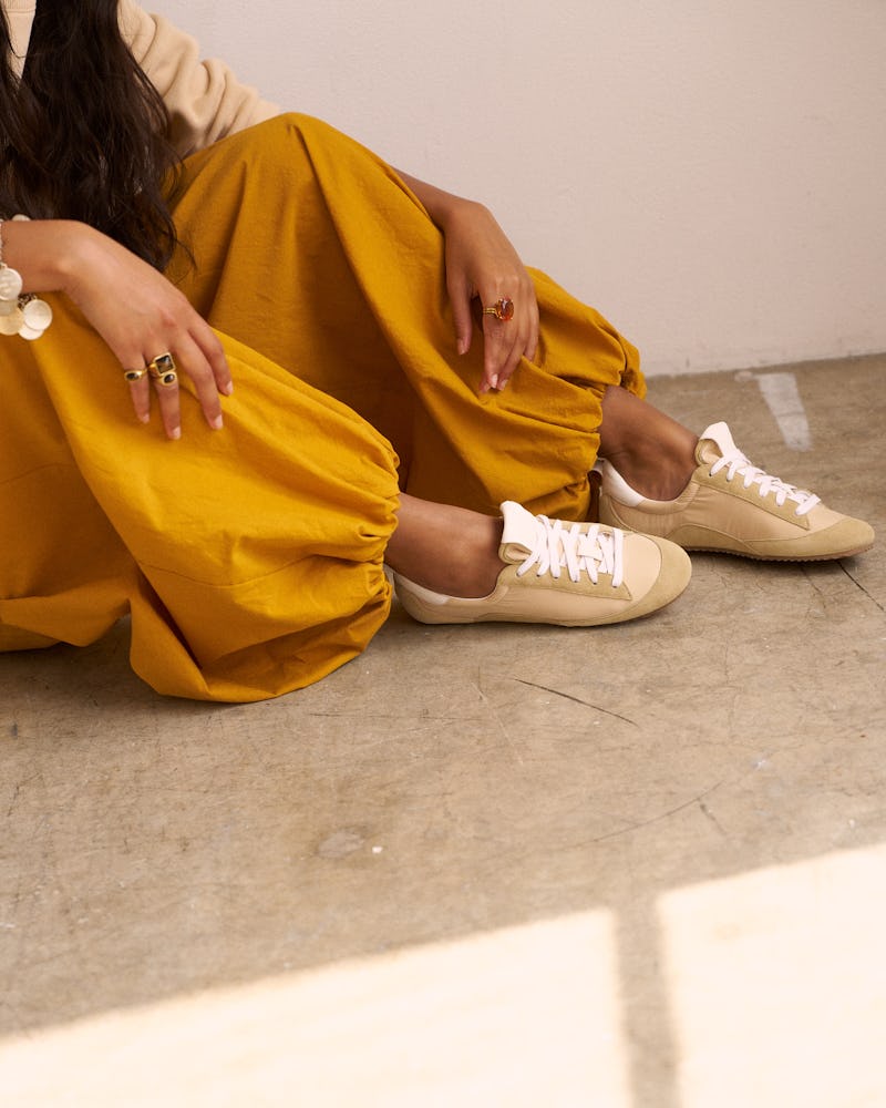 For the debut, she relied on Italian sacchetto construction, a technique that stitches the lining directly to the insole to create a softer, more flexible feel without the bulk of a stiff footbed — the same process Haller uses for the rest of her footwear. “It’s not the way 90% of people make shoes,” she shares, noting how the method sets the fit and feel of her footwear apart from others on the market. With the sneaker’s glove-like fit, Haller often skips socks altogether when wearing them, a styling trick her customers will no doubt adopt, too.