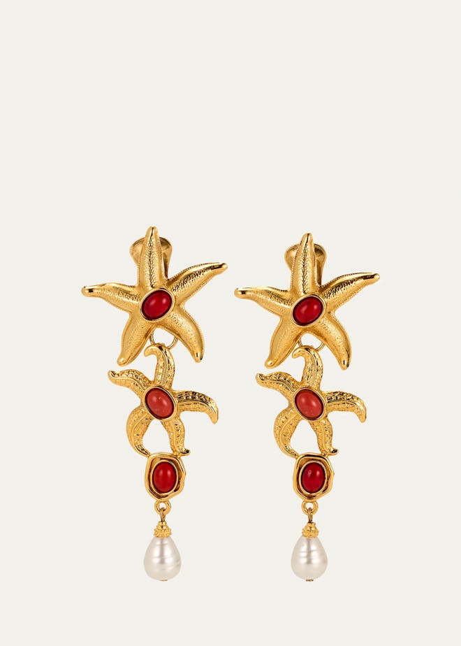 Ben-AmunStarfish Clip On Earrings with Pearly Drops and Coral Stones