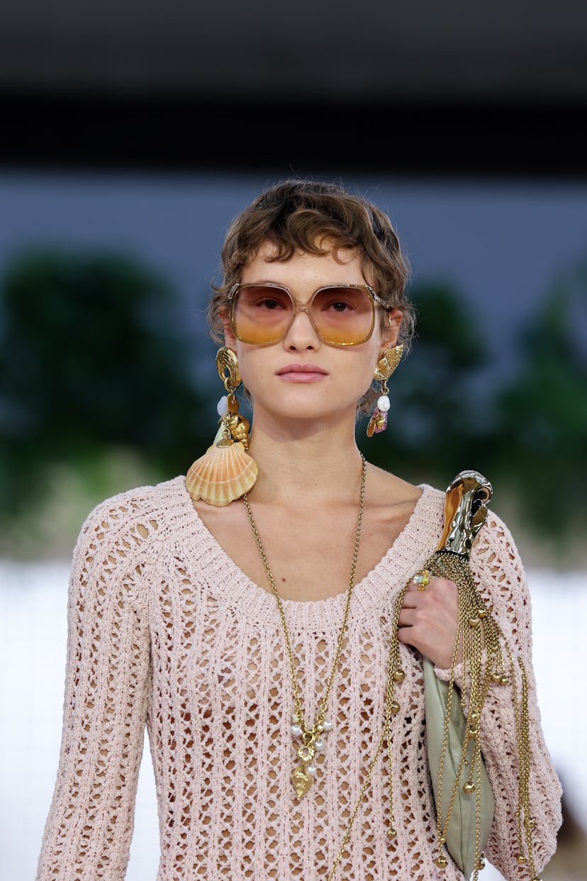 Nautical jewelry made waves on the Spring/Summer 2025 runways as well. Chloé, naturally, led the charge, sending models down the runways dripping in beachy seashell necklaces and earrings. Roberto Cavalli, meanwhile, showed a chunky gold necklace with a larger-than-life swordfish attached.