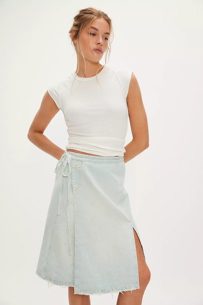 In addition to its cool and versatile wrap detail, this light wash denim skirt features a sexy side slit that adds the perfect dose of interest.