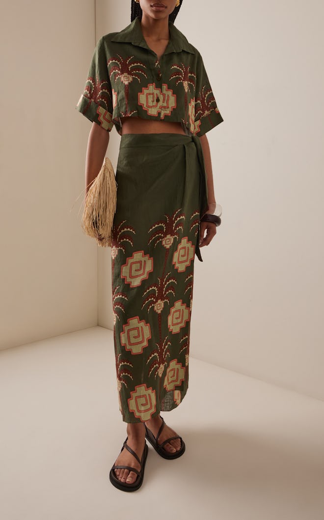 And Colombian-based Carolina K offers vacay-ready linen styles with hand-appliqué detailing. "We’ve been making wrap skirts for quite some time now, and they continue to be one of our clients’ favorite pieces,” explains Carolina Kleinman, founder and creative director of Carolina K. “We love their versatility, some can double as pareos or even beach towels, while others can be elevated with a crisp shirt and flats, heels or barefoot for a dinner by the water or al fresco. Comfortable, timeless, and effortlessly chic, the wrap skirt is a classic silhouette that never goes out of style."